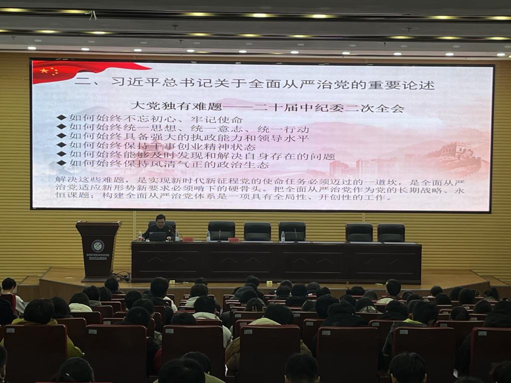 陈庆福以“坚定不移全面从严治党 深入推进新时代党的建设新的伟大工程”为主题,从如何理解以自我革命引领社会革命、习近平总书记关于全面从严治党重要论述、坚定不移全面从严治党等三个方面进行了全面、深入、系统的解读。讲座内容丰富、逻辑清晰、论述深刻。