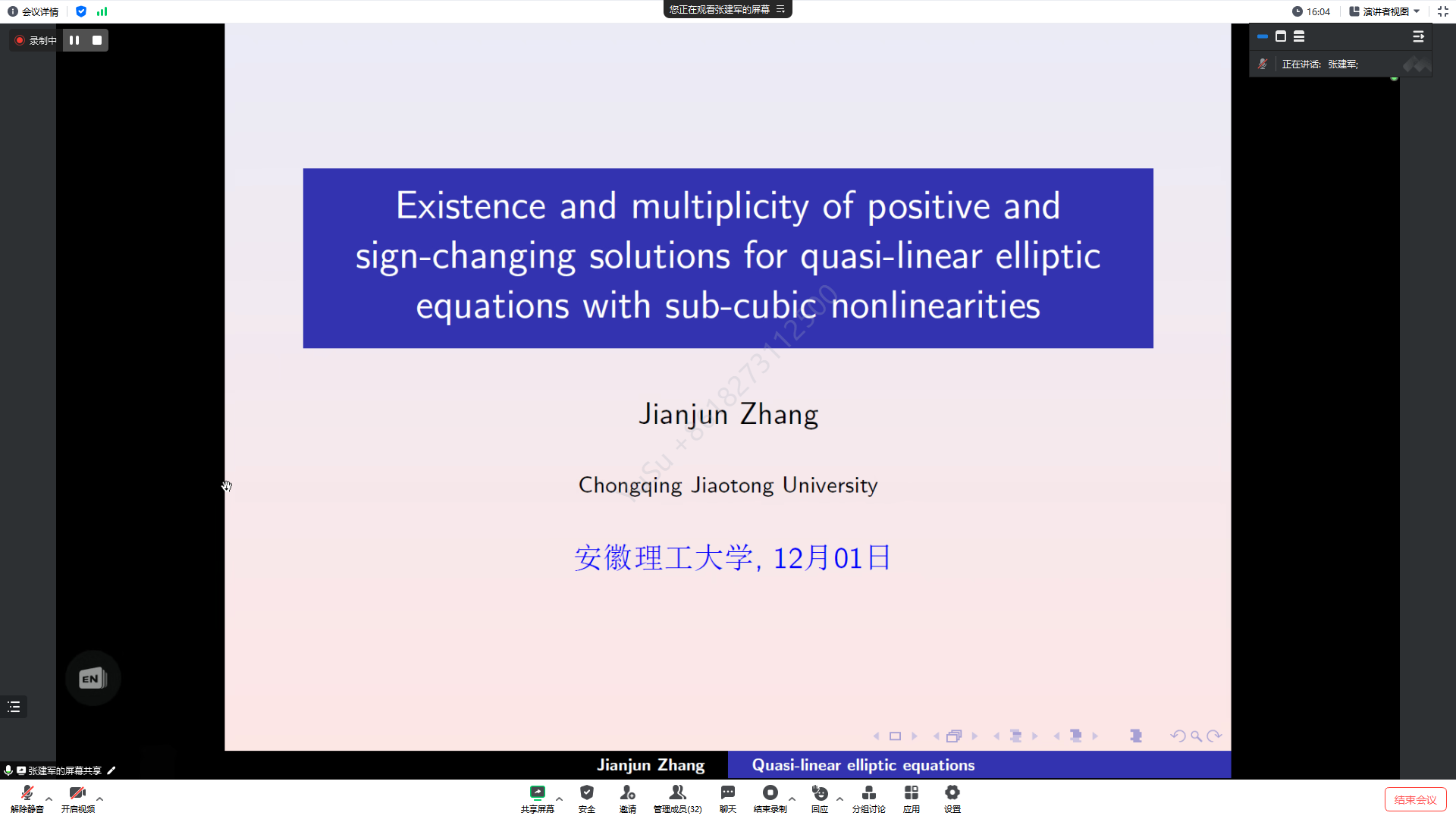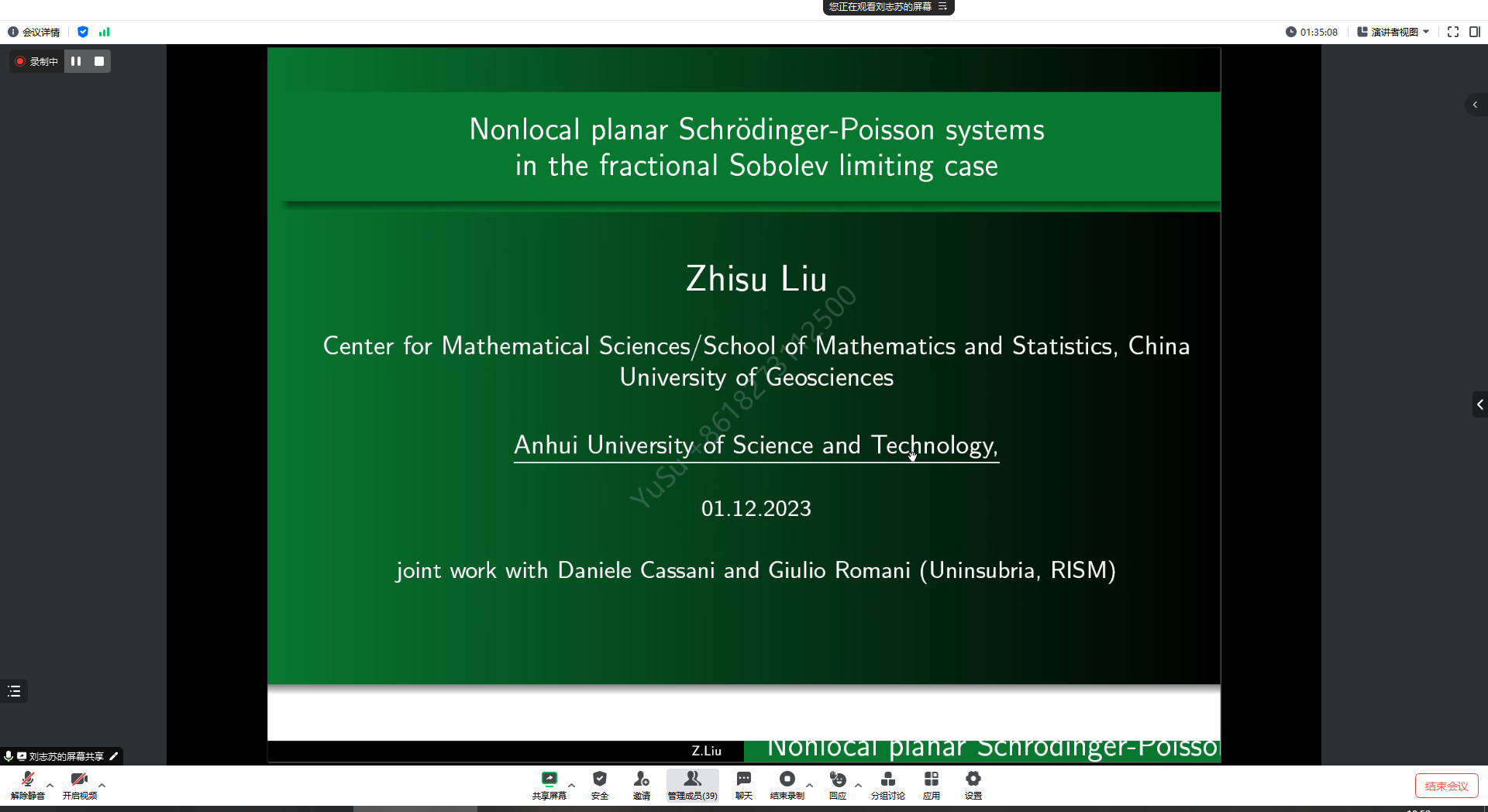 12月1日上午,应科研部和数大学院的邀请,中国地质大学(武汉)刘志苏教授通过腾讯会议作了“Nonlocal planar Schrödinger-Poisson systems in the fractional Sobolev limiting case”(分数阶Sobolev极限下平面上非局部薛定谔泊松系统)的学术报告;重庆交通大学张建军教授通过腾讯会议作了“Existence and multiplicity of positive and sign-changing solutions for quasi-linear elliptic equations with sub-cubic nonlinearities”(具有次立方非线性项拟线性椭圆方程正解和变号解的存在性和多解性)的学术报告。数大学院微分方程与动力系统团队青年老师和研究生等40余人参加了学术报告。