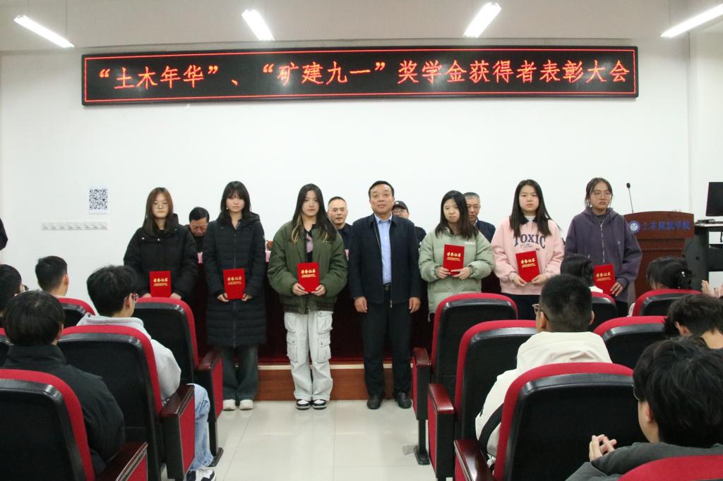 设立“土木年华”奖助学金校友代表丁祥训、沈景钊、陆卫国,设立“矿建九一”奖助学金矿建95届带班辅导员王永祥,为获得校友奖学金学生代表颁奖。