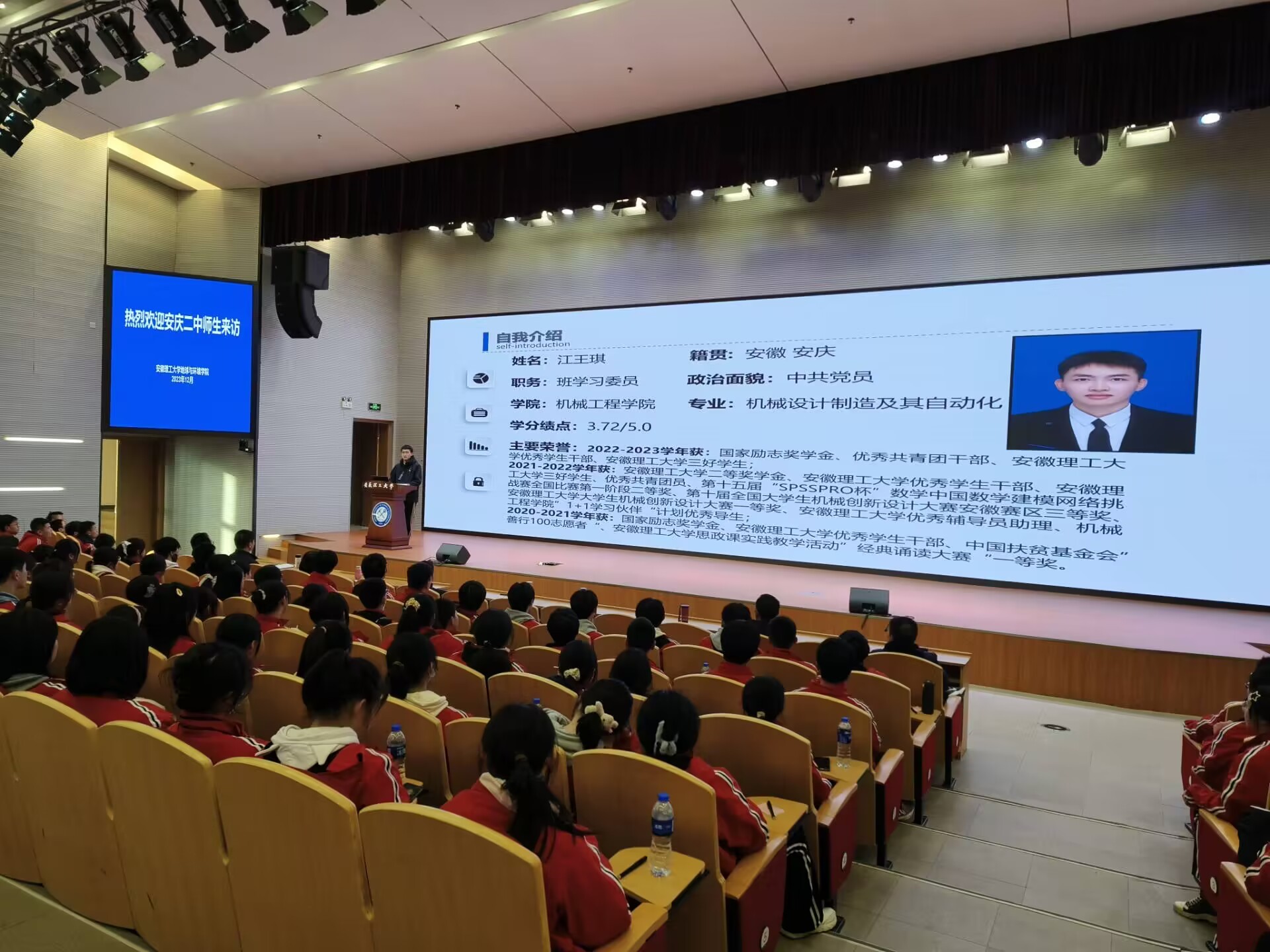活动伊始,研学师生在舜耕会堂共同观看安徽理工大学宣传片。地球与环境学院党委书记陈楠,安庆二中党委委员、副校长杨春分别致辞。陈楠以《走进安理,助学筑梦》为题向研学学子介绍了校史校情,安庆二中毕业生、机械设计制造及其自动化专业2020级学生江王琪作大学学习生活报告。
