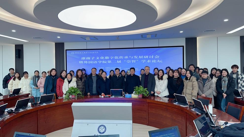12月17日,由安徽理工大学外国语学院主办,淮南师范学院外国语学院、外语教学与研究出版社、淮南子文化数字化传承与发展安徽省哲学社科重点实验室协办的“淮南子文化数字化传承与发展研讨会暨第二届‘崇智’学术论坛”在百川楼同传实验室召开。本次论坛以助力传播地方传统文化,推进人文社科特色研究”为主题,邀请湖南大学、淮南师范学院等国内知名高校学者作主旨报告,并按照参会学者提交的论文摘要设置两个分论坛。淮南市社科联、校科研部、外国语学院以及在淮其他高校师生共计40余人参加。