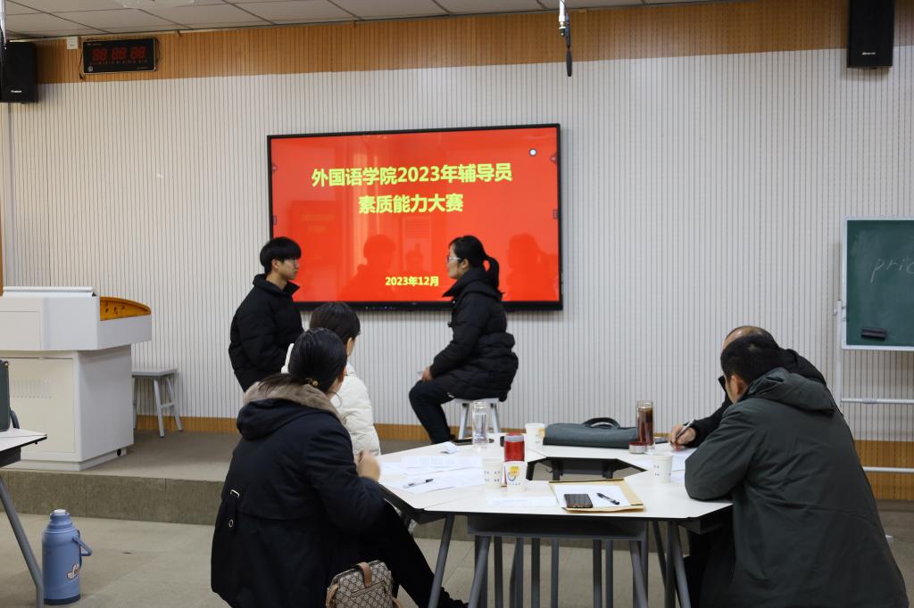 12月17日,为加强辅导员队伍建设,以赛导学、以赛代训、以赛促建,全面提升辅导员的素质能力,提高辅导员岗位胜任能力,外国语学院在百川楼东305室举办2023年辅导员素质能力大赛。外国语学院全体在岗专职辅导员参加本次比赛。