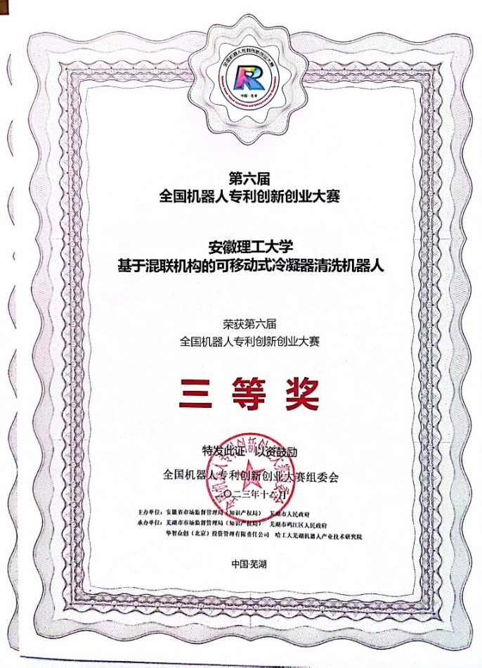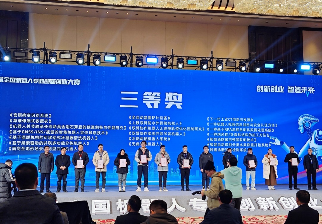 12月16日,第六届全国机器人专利创新创业大赛决赛在安徽省芜湖市成功举行。由人工智能学院选送的参赛作品《基于混联机构的可移动式冷凝器清洗机器人》(参赛学生:李家宝,指导老师:王成军)荣获全国三等奖,《混联桁架式可移动重载铸造机器人》荣获全国优秀奖(参赛学生:刘庆,指导老师:王成军)。