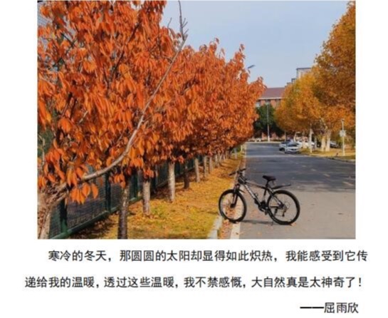 11月16日至27日,学院举办“冬日暖阳”心理照片征集活动,鼓励学生拥抱阳光、享受阳光、追逐阳光,享受冬日美好时光。学生参与积极性高,提交照片极具感染力,所配文字温暖生动,充分展现了大学生丰富的校园生活和健康向上精神状态。
