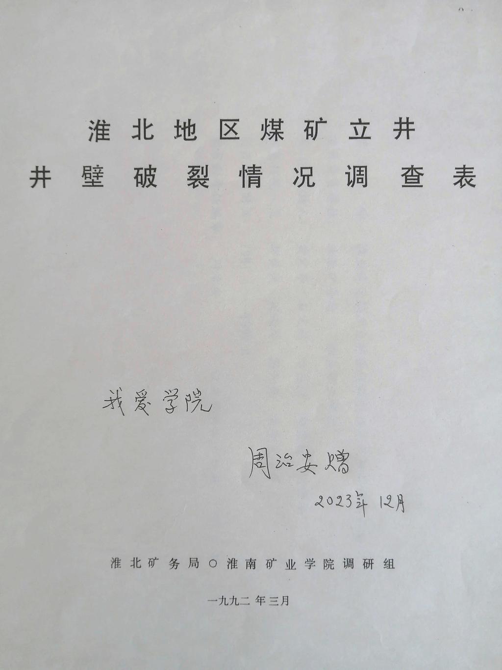 交流中,周治安教授回忆了二十世纪六十年代他被选调地质力学研究所,在李四光同志安排下,在西昌开展地震断裂带调查的点滴,介绍了二十世纪九十年代淮南矿业学院调研组在淮北地区开展煤矿立井井壁破裂情况调查的过程。赠书时,他郑重而又深情地在赠物上写下“我爱学院”。