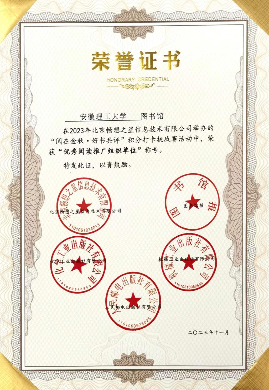 近日,由图书馆报、化学工业出版社有限公司、机械工业出版社有限公司、人民邮电出版社有限公司、北京畅享之星信息技术有限公司联合举办的2023年读书月活动——“阅在金秋·好书共评”积分打卡挑战活动圆满结束,我校图书馆在此项活动中荣获“优秀阅读推广组织单位”荣誉称号。