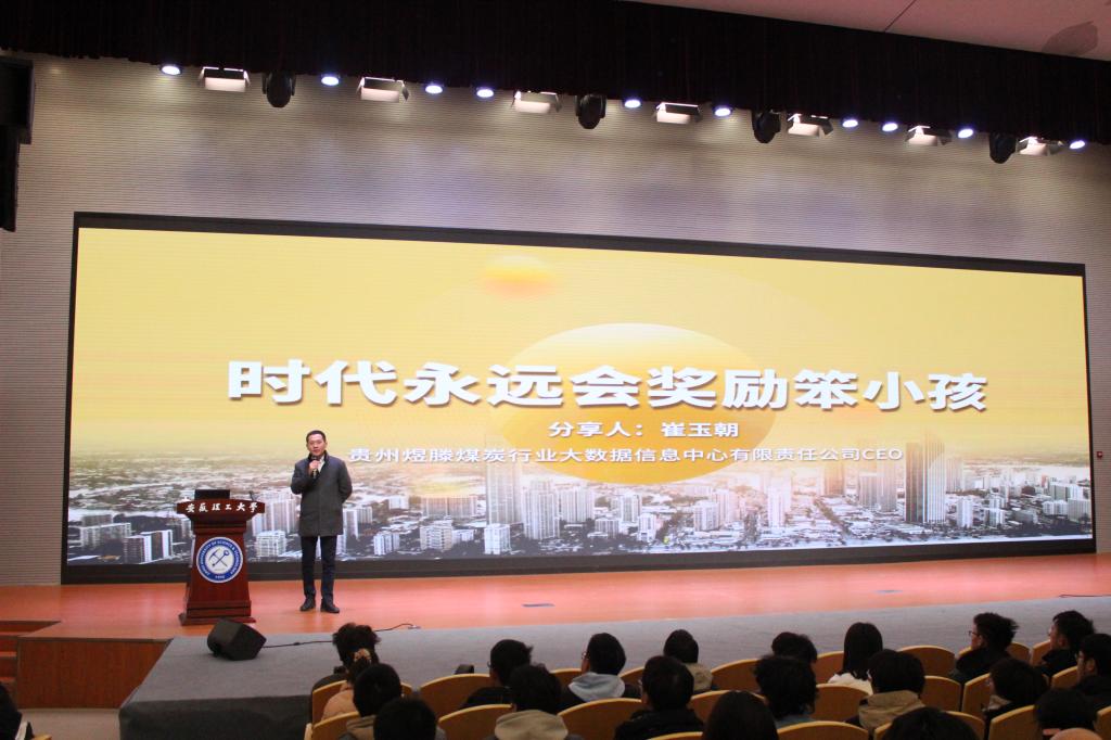 报告会上,崔玉朝以《时代永远会奖励笨小孩》为题,结合自己求学、从“铁饭碗”事业单位工作到自主创业、从山东到贵州、从传统煤炭行业到煤炭+大数据,二十年来的学习、工作经历,分享了个人心路历程和成长感悟。他用“地质员的故事”“打扫楼道的故事”等一个个小故事鼓励同学们要努力培养个人兴趣爱好,多读书,读好书,从经典著作中汲取经验;要坚定学习信念,养成学习习惯,努力向身边的人学习,不断增强个人知识储备和专业技能;要学会总结提升,清晰认识自己,了解自身不足;要热爱专业,从细节入手,从小事做起,做好个人学业规划。在报告中,他勉励广大同学要立足专业,寻求突破,注重跨专业、跨行业融合,成为一名复合型人才,要通过接受现实的挑战和不断学习,实现个人的职业成长和突破,在人生中找到自己、认可自己、活出自己、超越自己。