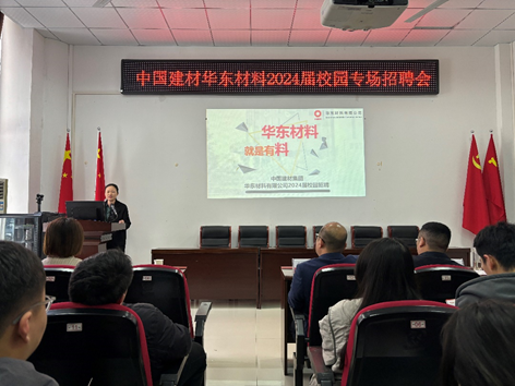 为进一步落实2024届毕业生就业工作,抓住春季关键就业期,使更多毕业生优质就业,3月13日,中国建材华东材料有限公司在材料科学与工程学院B118室举办专场招聘会,华东材料合肥、苏州、无锡及南京公司相关负责人现场宣讲,学院党委副书记陈向君出席并讲话,毕业班辅导员和2024届毕业生参会。