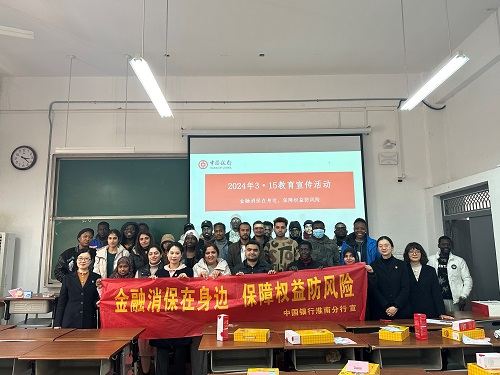 3月14日下午,国际学院邀请中国银行淮南分行和淮南市银监局的工作人员在明理北103教室举办“3·15教育宣传活动——中国银行金融知识讲座”,在校留学研究生参加了本次讲座。