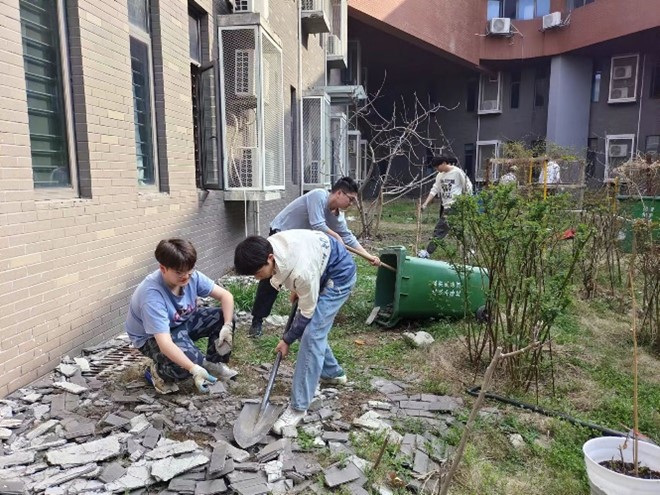 师生在清理建筑垃圾(摄影:马杰文)