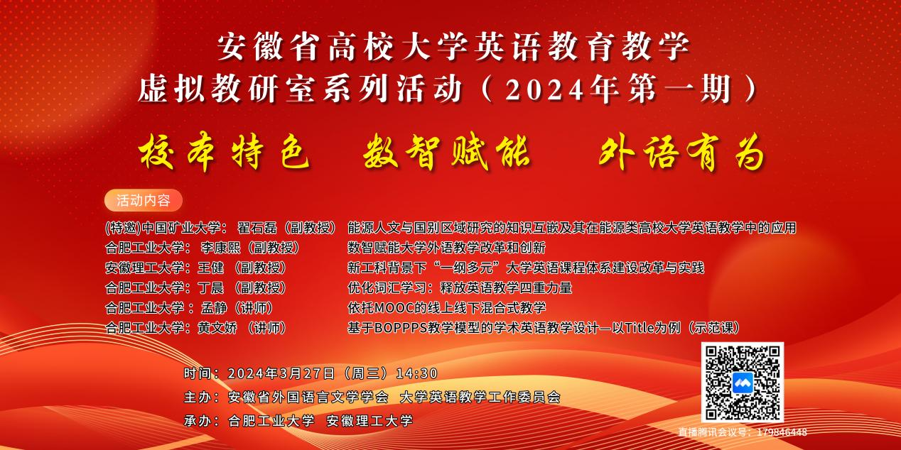 3月27日,以“校本特色、数智赋能、外语有为”为主题的安徽省高校大学英语教育教学虚拟教研室系列活动在线上举行。外国语学院全体教师参会,省内各院校近200名外语教师云端同步参会。外国语学院院长雷鹏飞主持闭幕式,副院长李争主持第一阶段主旨报告会。