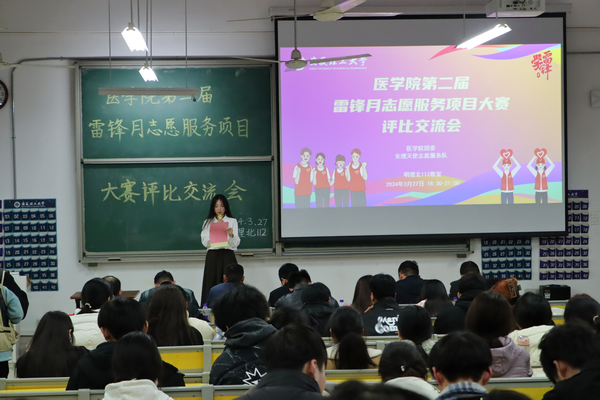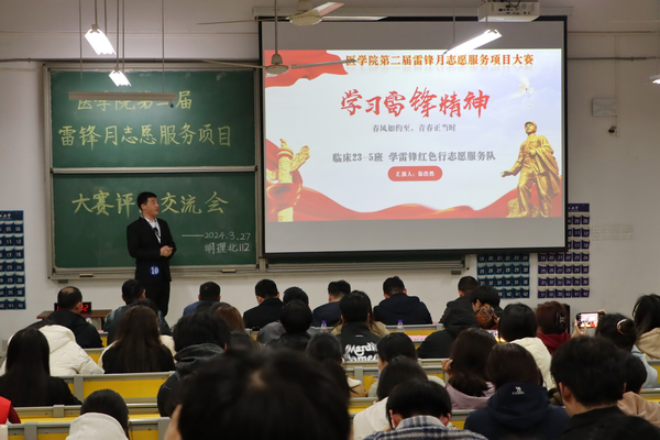 为弘扬新时代雷锋精神,培养青年学生们志愿服务意识,提升志愿服务能力,医学院举办第二届雷锋月志愿项目服务大赛。3月27日晚,评优答辩会在明理北112教室拉开序幕,学生处副处长刘瑞、土木建筑学院党委副书记张向林、机电工程学院党委副书记唐克、安全科学与工程学院党委副书记曹宣明等担任评委,约150余名学生现场观看比赛。