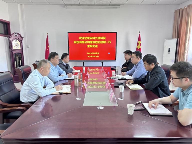4月24日,北京安科兴业科技股份有限公司总经理曲效成、分公司经理辛崇伟等一行到地球与环境学院调研交流。院长刘启蒙、副院长吴荣新参加交流会。