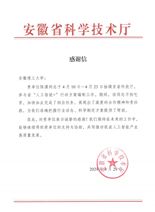 近日,安徽省科学技术厅向安徽理工大学发来热情洋溢的感谢信,感谢安徽理工大学在省“人工智能+”行动方案编制工作中的大力支持和慷慨相助,为安徽省科学技术事业发展作出的积极贡献,并对本单位陈潇同志提出表扬。