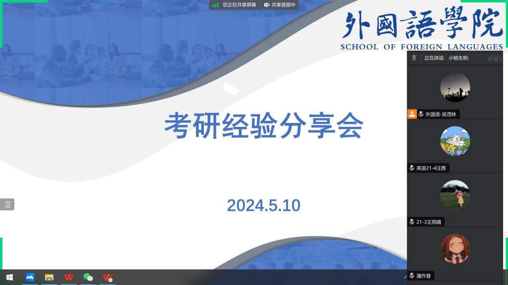 为厚植学子爱国荣校情怀,发挥优秀毕业生榜样引领和示范带动作用,积极营造热爱祖国、感恩母校、温馨和谐的毕业氛围,让爱国荣校情怀在广大外院学子心中牢牢扎根,5月6日至10日,外国语学院在“一站式”学生社区线上线下同步开展“我为学院做实事”公益服务活动。外国语学院2020级双优生和考研上岸优秀学子分别为2022级和2021级同学进行了经验分享。