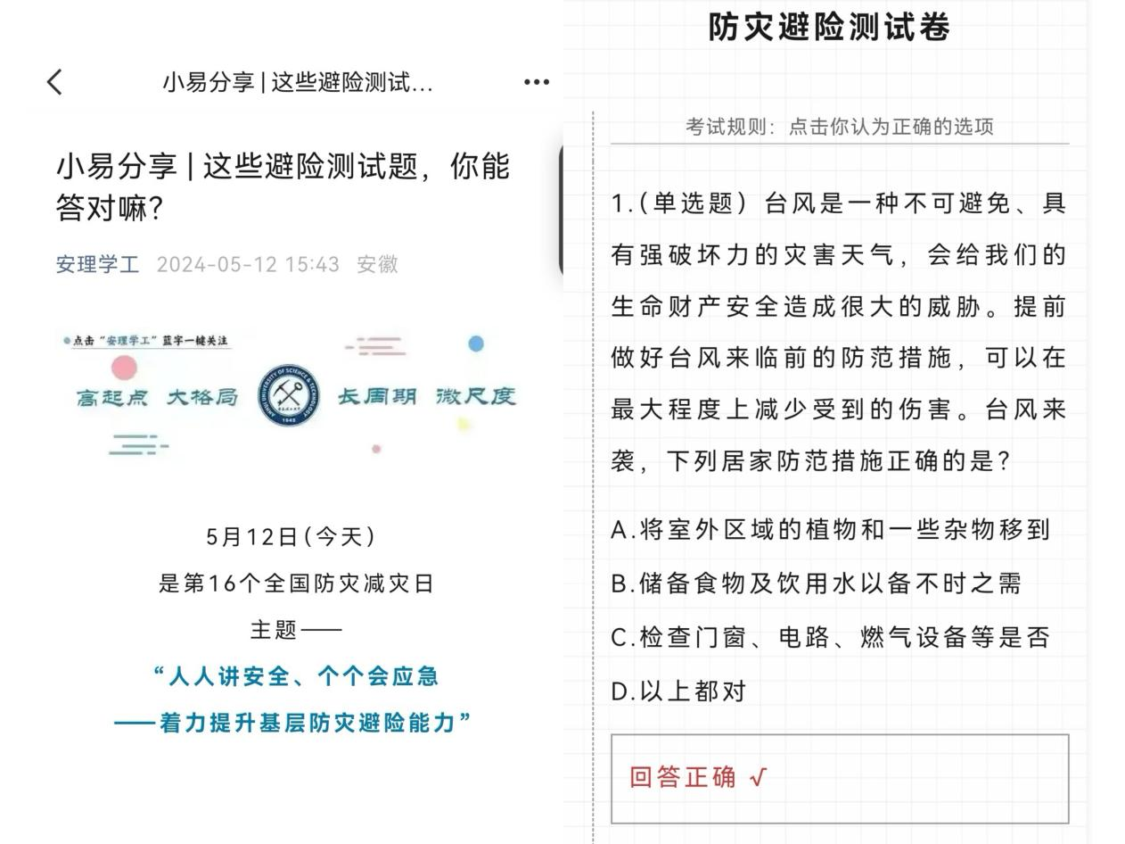 5月15日至17日,各年级团支部组织学生开展防灾减灾知识竞答活动,内容涉及灾害类型、预防措施、自救互救技巧等多个方面,辅助同学们对相关知识技能进行查漏补缺,切实检验防灾减灾技能掌握程度。