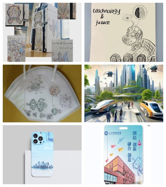 比赛现场,参赛选手们创新思路、脑洞大开,精心展示其作品。“在大多数人印象中,AI是没有感情的,但我认为AI也懂浪漫,所以采用仿生人脸与脑机结合的形式,用多巴胺色系描绘出我想象中的AI。”参赛选手傅萱兴致勃勃地介绍她的杰作。此外,本次比赛还征集到具有防盗、防尘、防水和显示剩余内存的新型U盘、以ChatGPT为标志的六色书签、印有智慧机器人图案的帆布袋、彩绘科技元素的文创口罩、建筑融合科技图案的卡套、带有科技和AI元素明信片、将电路板与城市建筑结合的手机壳等众多文创作品。结合比赛要求和作品情况,最终11名选手的作品通过初选进入网络投票环节。