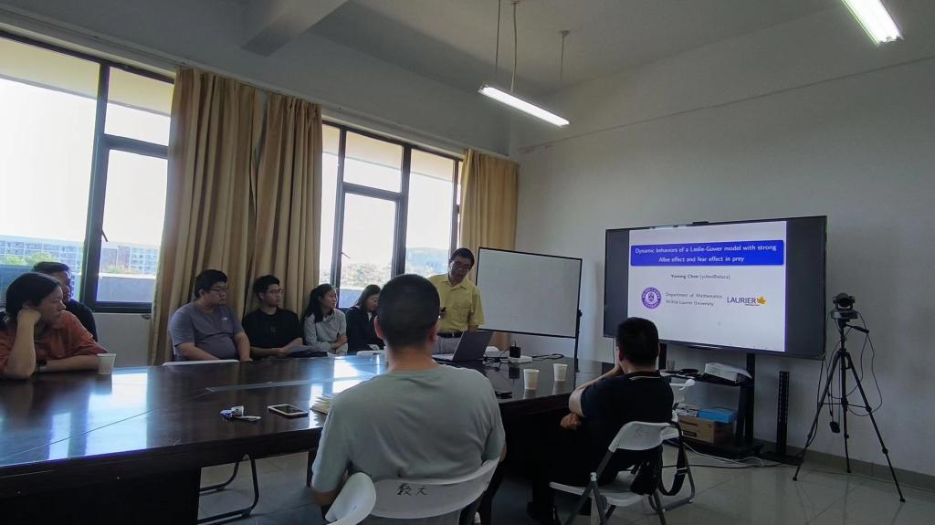 5月27日下午,加拿大罗瑞尔大学陈玉明教授和嘉兴大学刘炳文教授应数大学院邀请,分别作了题为“Dynamic behaviors of a Leslie-Gower model with strong Allee effect and fear effect in prey(考虑被捕食者具有强Allee效应和恐惧效应的Leslie-Gower模型的动力学行为)”和“动力系统研究中一些数学分析技巧”的学术报告。副院长段炼主持报告会,微分方程方向的青年教师和硕士研究生参加报告会。