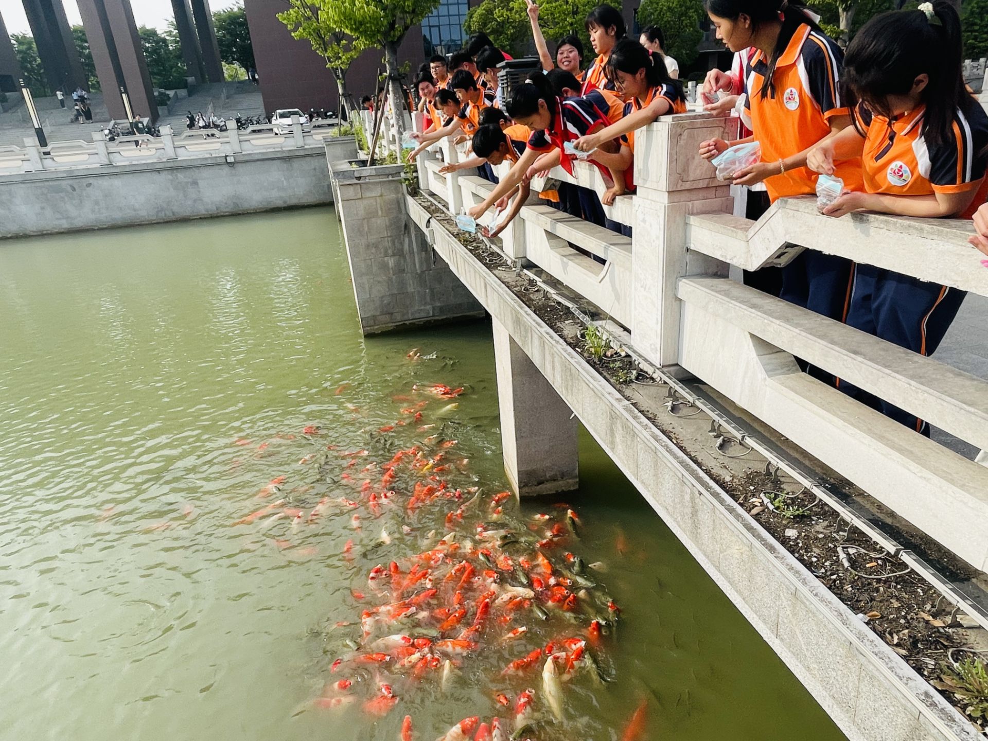 在百川楼前,志愿者带着孩子们一起投喂湖中的锦鲤。一包包鱼食分发到孩子们手中,湖中的锦鲤似乎也感受到了孩子们的热情,纷纷聚集在一起等待孩子的投喂,现场温馨而热烈,孩子们欢呼雀跃,鱼儿们竞相逐食,演绎了人与自然和谐美丽的生动画卷。从投喂中,孩子们也学会了耐心等待,细心观察,维护生态平衡等道理。