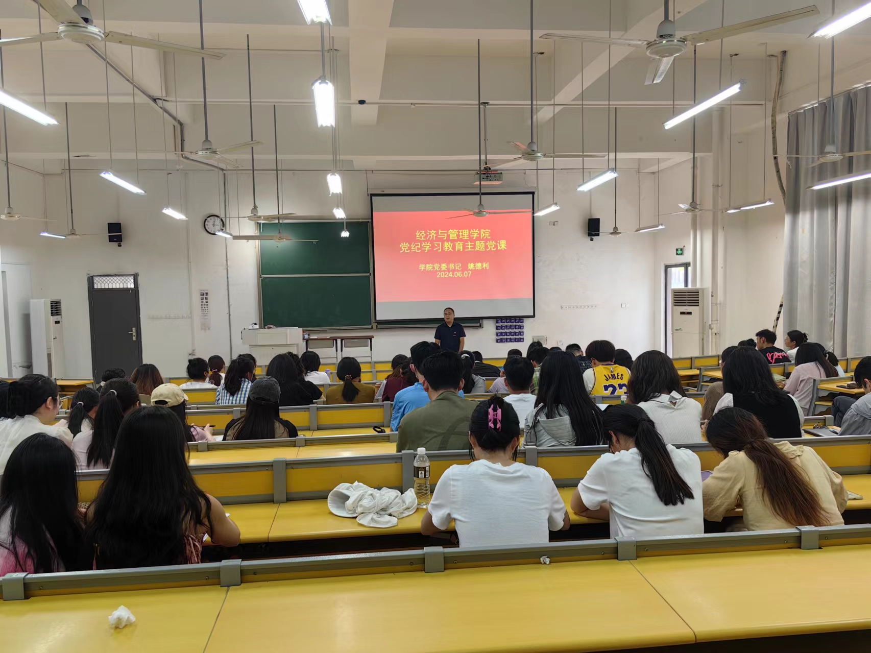 6月7日,经济与管理学院在明理105举办党纪学习教育专题党课,本次党课由学院党委书记姚德利主讲,学院全体师生党员参加。