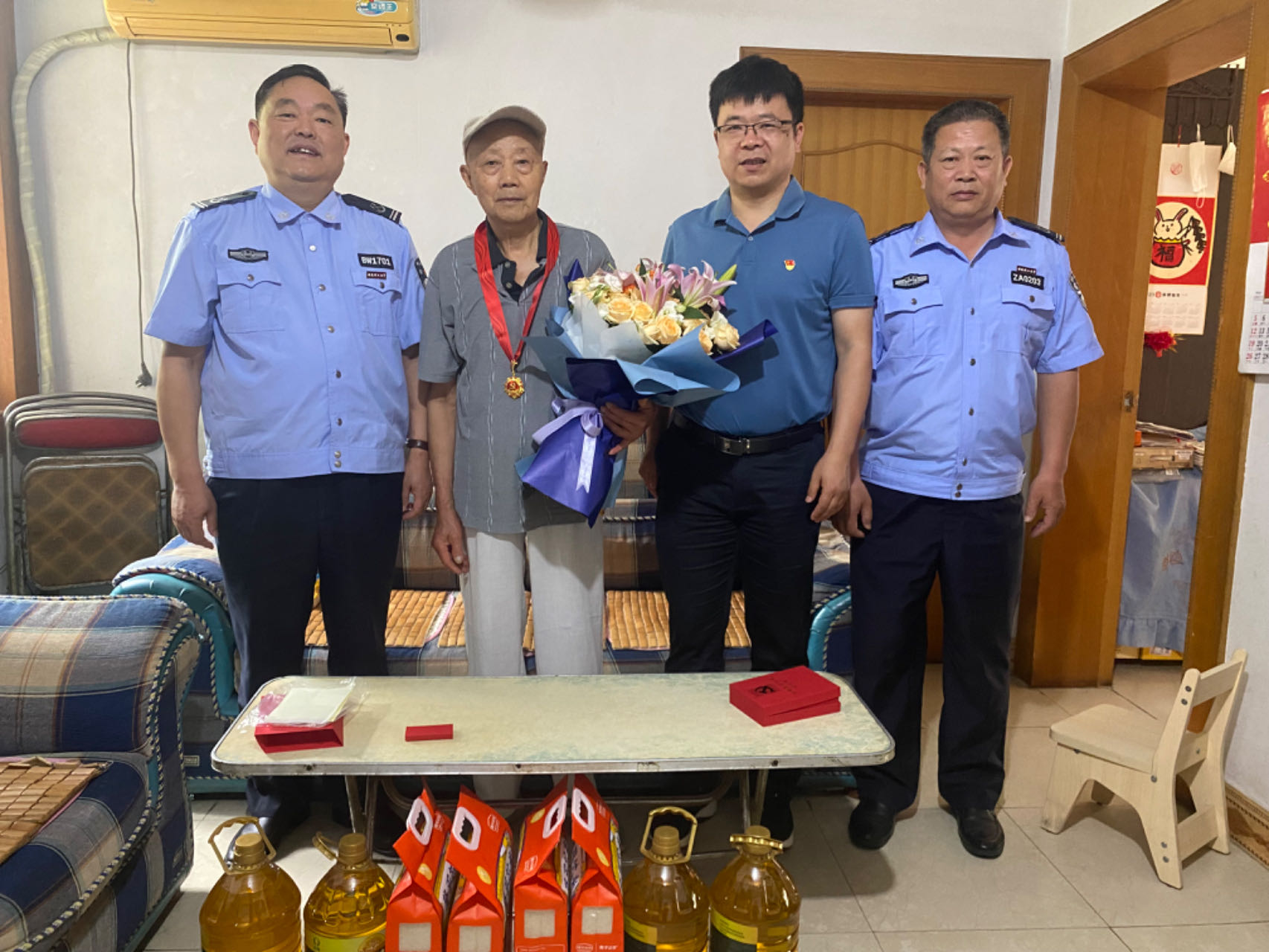 在建党103周年来临之际,根据学校党委的工作部署,6月26日上午,机关党委书记王从东、保卫处党支部书记方运纪一同走访慰问了保卫处老党员尹学金同志,向他致以节日的问候和诚挚的祝福,并为他颁发“光荣在党50年”纪念章。
