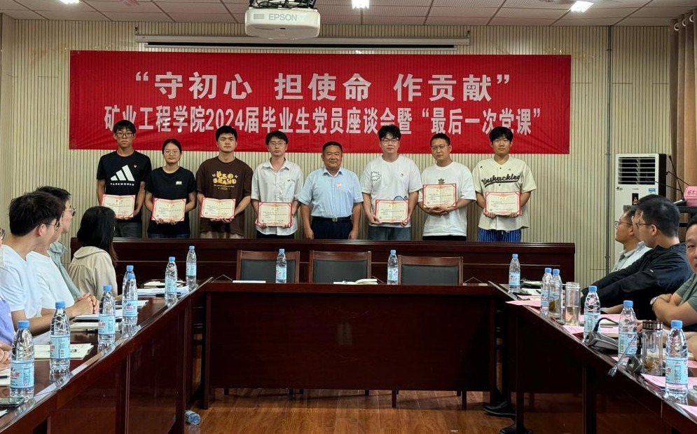 6月12日下午,矿业工程学院在宁远楼A410会议室召开“守初心 担使命 作贡献”2024届毕业生党员座谈会暨“最后一次党课”。学院党委书记盛鹏飞为毕业生党员代表佩戴党员徽章,并代表学院党委,向圆满完成学业、踏上人生新征途的毕业生党员们致以衷心的祝贺,他强调,全体毕业生党员要牢记党员身份和安理人身份,不忘入党初心,坚定理想信念,时时处处事事展现安理大党员形象;要自律自修自学,将党纪内化于心,外化于行,迈出廉洁从业第一步;要长怀感恩之心,铭记父母养育之恩、师长教诲之恩;要争做先锋,敢于担当,充分发挥先锋模范作用,勇担时代赋予的重任。