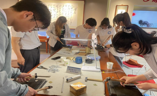 随后,学生们拜访了非遗文化吴山铁字的传承人郑书山先生。郑老师热情地向学生们介绍了吴山铁字的起源、发展以及制作工艺。通过郑老师的讲解和示范,同学们了解到,铁字制作不仅需要传承人对书法有着极高的造诣,还要求传承人对力的精确把控,体现出如今非遗文化传承的不易。在郑老师的指导下,学生们亲自动手尝试制作吴山铁字,感受这一传统技艺的独特魅力。
