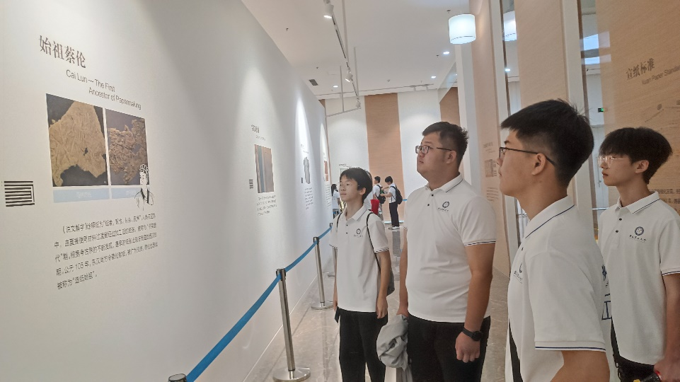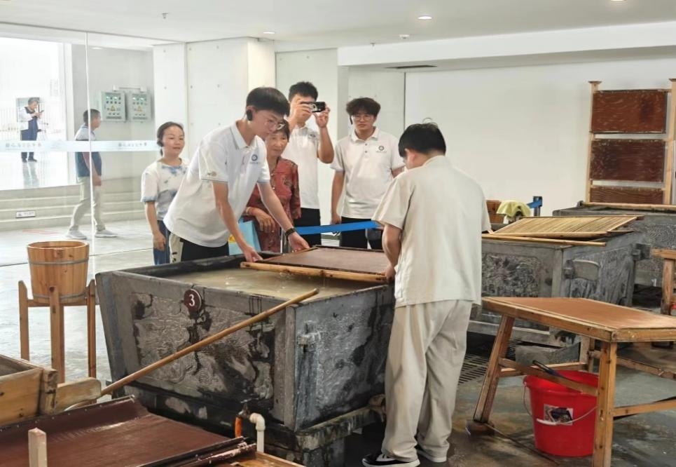 实践团队走进中国宣纸文化园,近距离观看了宣纸制的各项工艺,并实操体验了捞纸的工艺技法。捞纸步骤看似简单,实则细节满满,不得有一点差错。师傅们将早已准备好的板子与纸帘过水,使纸帘上均匀的布满纸浆,静置,滤水。之后将纸与纸帘掀开,分离,晾晒。几分钟之后,湿纸在烘干机上烘干,一张宣纸才最终得以面世。实践队员们深感宣纸作为非物质文化遗产,其所代表独特文化的背后也蕴含着中国人特有的工匠精神。