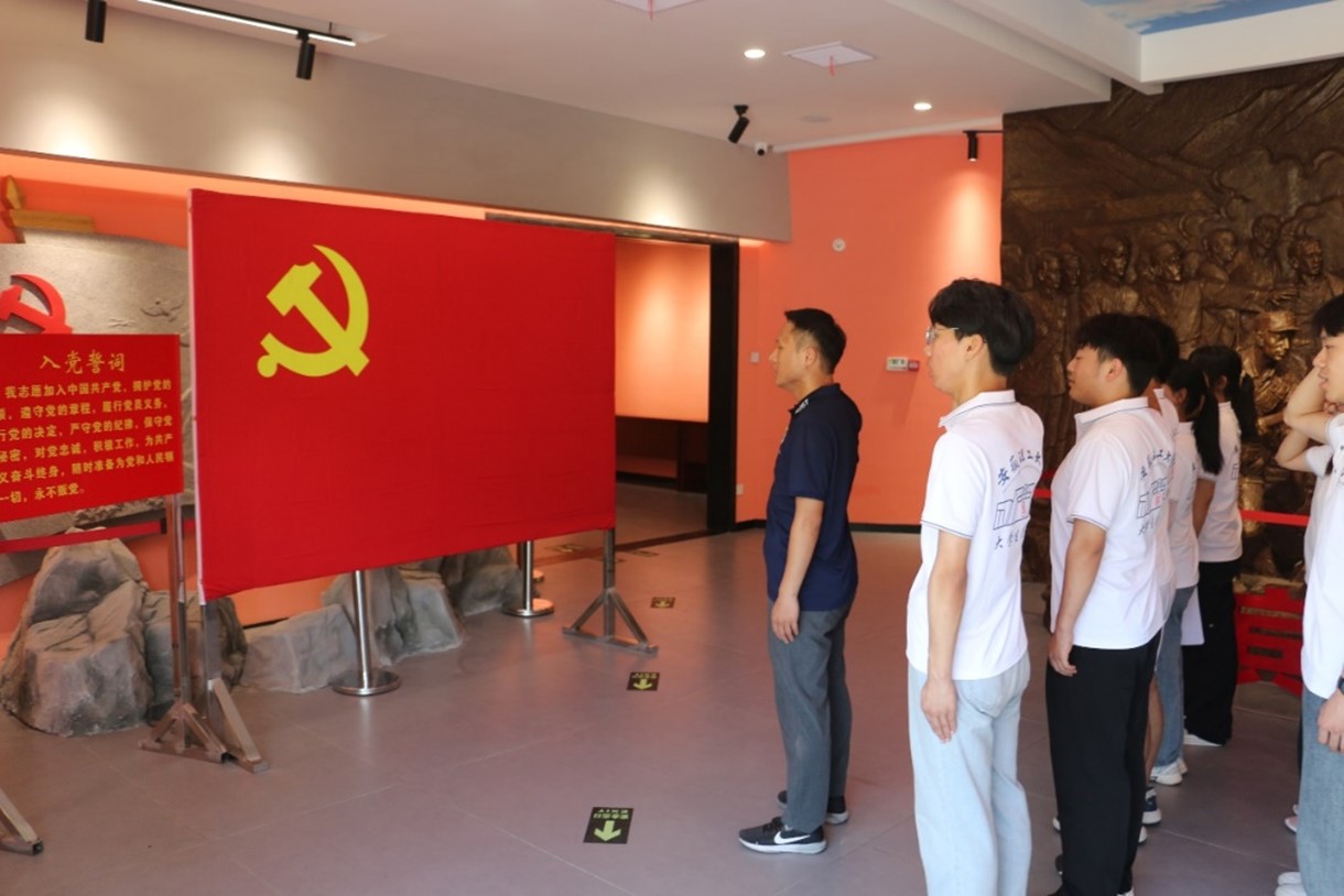 在纪念馆内,面向鲜红的中国共产党党旗,带队指导老师许运山领誓,同学们高举右拳,郑重宣誓。誓言声铿锵有力,表达了同学们坚定不移听党话、跟党走的决心,展示了同学们矢志不渝、接续奋斗的恒心,彰显了同学们担当作为、奋勇前进的信心。