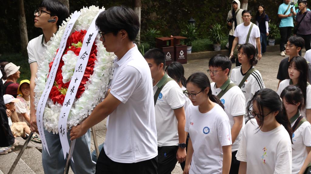随后,队员们抵达当天实践研修的最后一站——北山烈士陵园。在井冈山革命根据地创建过程中,牺牲的革命烈士多达4.8万人,其中有名有姓的烈士有15744人,他们的名字都刻在北山烈士陵园的英烈墙上。烈士陵园内游客如织,大多数都是来自全国各地的大学生。队员们和这些青年学子组成整齐的方阵,向革命烈士鞠躬默哀、敬献花圈,并面向团期重温入团誓词。
