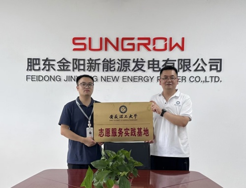 为巩固此次实践活动的成果,持续深化双方合作、实现共赢发展,阳光电源公司负责人张锐与实践团队指导老师韩涛在肥东金阳电站,共同为“安徽理工大学志愿服务实践基地”揭牌,这一实践基地的建立,将开启学校学院与企业合作的新篇章,为学校社会实践活动提供新平台、注入新活力。