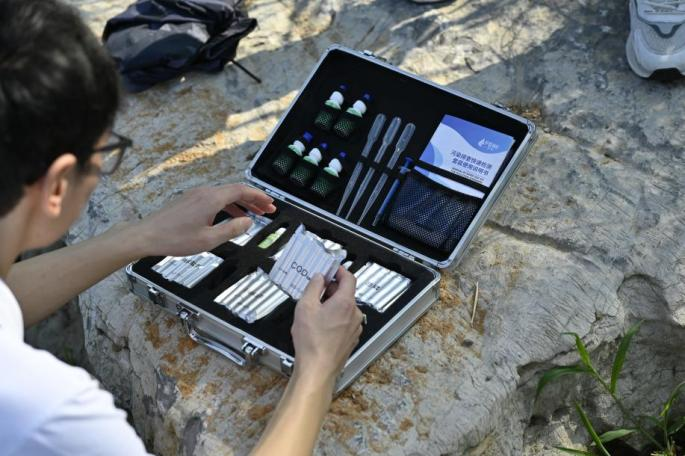 调查队队员在骆岗公园进行水质检测
