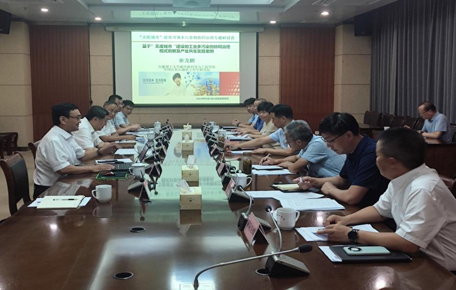 何田主持专题研讨会。崔龙鹏教授作题为“基于‘无废城市’建设的工业多污染物协同治理模式创新及产业共生实践案例”的主题报告,从工业固废绿色低碳循环利用模式创新、典型行业综合污染防治(IPPC)协同增效探索、基于工业副产物协同利用(BPS)的产业共生实践探索案例等方面汇报了国内外以“无废城市”建设引领多污染物协同治理的进展与思考。沈建群作“铜陵市‘无废城市’建设情况”报告,介绍了国家首批安徽省首个“无废城市”创新模式探索和成效。市政府各相关部门领导和企业负责人分别汇报了协同推进铜陵市“无废城市”建设的进展及工作计划。与会人员针对主题进行了深入研讨,高登榜和何田作研讨会总结。双方进一步加强合作,建立定期专题研讨交流和项目对接会商机制,构建科技创新基地或孵化平台; 建立人才培养与学生就业、产教融合和科教融汇创新模式,为铜陵市高质量发展提供人才和科技支持;以“无废城市”建设为契机,加强同铜陵企业、科研院所协同创新,在“无废集团”、“无废园区”等工业多污染物协同治理领域,开展联合项目攻关,实现校地、校企合作共赢。