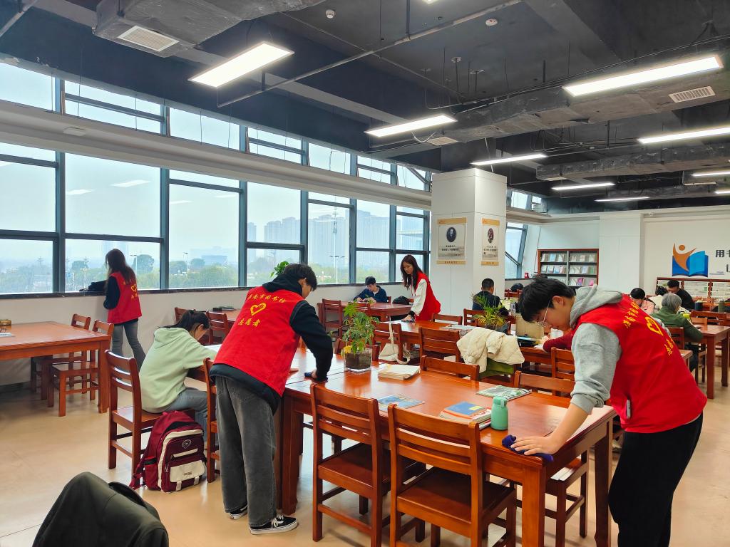 仪式结束后,医学院的志愿者们对图书进行整理归纳,将散乱在阅览区的各类图书按照分类逐一归位,确保每一本书都能找到自己的“家”。指尖划过书脊,带走的是浮尘,留下的是对知识与文化的敬畏。阅览区内,志愿者们手持抹布和清洁剂,细致擦拭每一张桌椅,每一列书架,让木质的纹理焕发温暖的光泽,为读者营造一个干净、舒适的阅读环境。