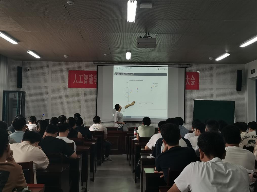 夏海研究员作了《Boosting SAT-based local improvement methods》的学术报告,介绍了SAT-based Local Improvement (SLIM),提出了自适应配置器来提高TW-SLIM的性能以及ICP桥接离线和实时配置器,对SLIM框架进行系统化配置,以提高求解不同计算难度组合问题的效率。