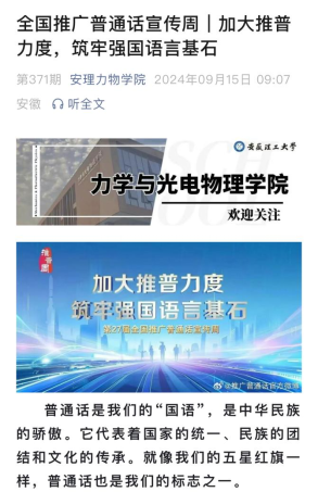 雅言传千秋,共筑语言梦。为加强对语言文字法律法规和方针政策宣传,提高全院师生说普通话、用规范字的意识,每年9月的第三周为全国推广普通话宣传周,力物学院以第27届全国推广普通话周为契机,开展了系列主题活动。