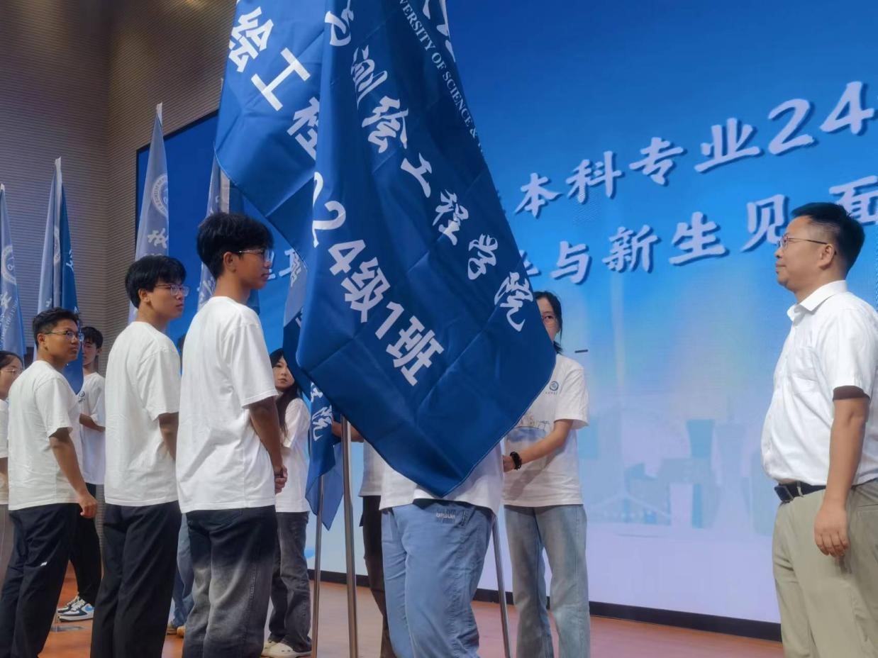 在热烈的掌声中,学院行政负责人王磊为各新生班级授班旗。一面面鲜艳的班旗在会场上飘扬,象征着新生们即将开启的充满希望与活力的大学生活。班旗的传递,不仅是一种仪式,更是一种责任与使命的传承,激励着新生们为班级的荣誉而努力奋斗。