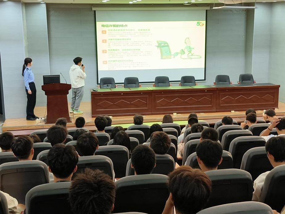 讲座过程中师生互动频繁,学生代表上台讲述自己对于电信诈骗的理解,现场气氛热烈。