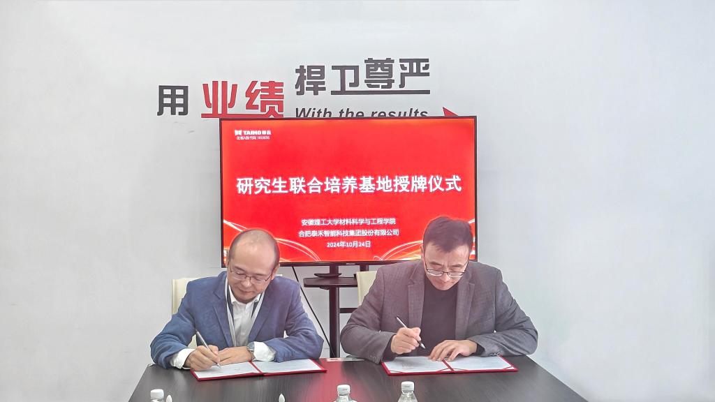 近日,材料科学与工程学院与合肥泰禾智能科技集团股份有限公司共建的研究生联合培养基地授牌仪式在合肥举行。学院院长闵凡飞、副院长王庆平、矿物系负责人、泰禾集团战略运营中心总监赵平、卓海智能事业部副总经理兼研发中心总经理王金诚、集团人力资源中心副总监欧绪龙等人员参加。
