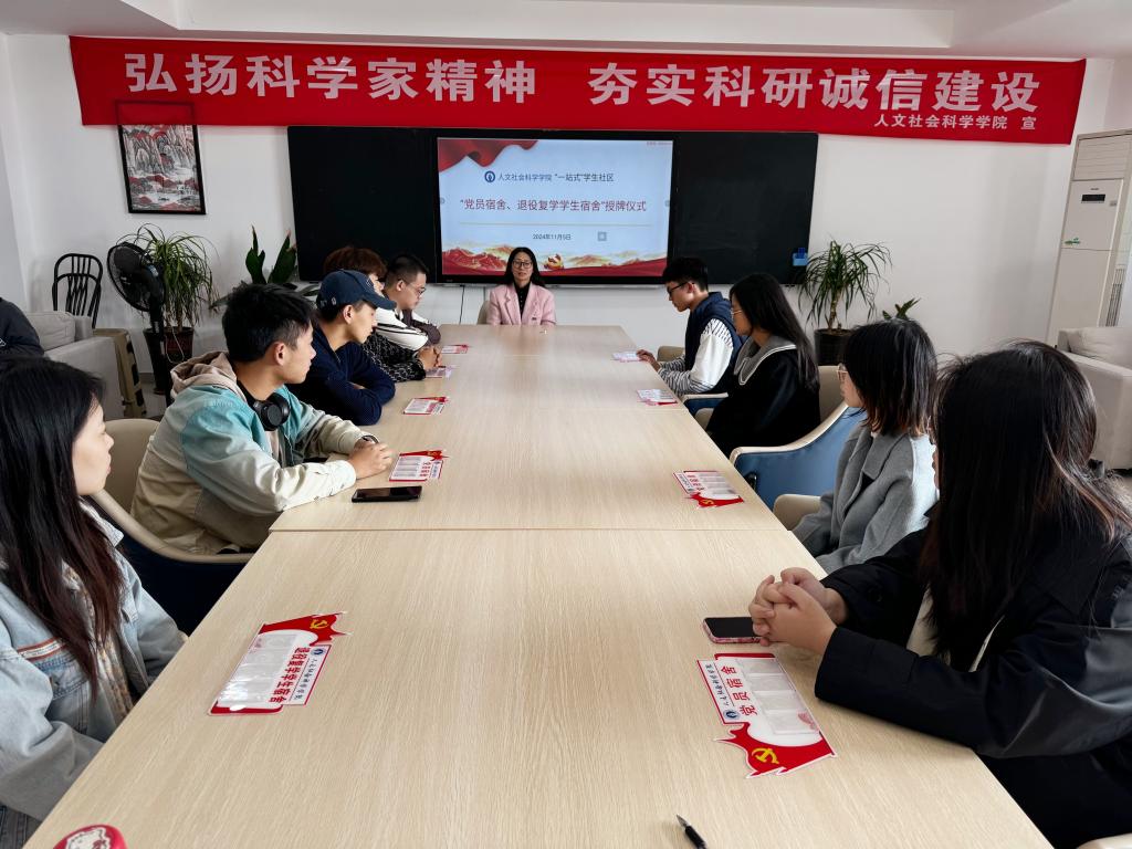 为了丰富学院宿舍文化活动,展现出特色宿舍的示范引领作用,同时增强学生党员、退役复学学生的责任感和使命感,11月5日下午,人文社会科学学院在“一站式”学生社区举行“党员宿舍、退役复学学生宿舍”授牌仪式。学院党委副书记周雪晴、学生辅导员及全体学生党员、退役复学学生共30余人参加。