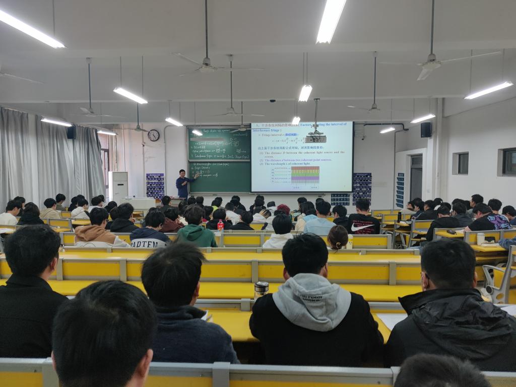 本次课程的主要内容为“杨氏双缝干涉实验”。教学过程中,徐华锋老师先通过回顾前面学习的内容对知识点进行梳理,从而循序渐进地引出后面的课程内容。徐华锋老师采用中英文相结合的形式进行授课,学生们积极参与互动,课堂气氛热烈。