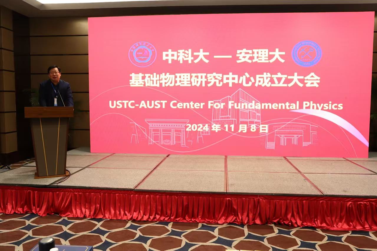 11月8日上午,中国科学技术大学-安徽理工大学基础物理研究中心成立大会在合肥市隆重举行,校党委常委、副校长张平松,中国科学技术大学物理学院党委书记周正威出席活动并致辞。校科研部部长刘辉主持大会。中国科学技术大学原副校长、安徽理工大学力学与光电物理学院名誉院长周先意,中国科学技术大学天文与空间科学学院副院长孔旭、物理学院教授韩良、陈向军、林子敬、彭新华、刘建北,安徽理工大学力学与光电物理学院负责人,以及40余名师生代表参加会议。