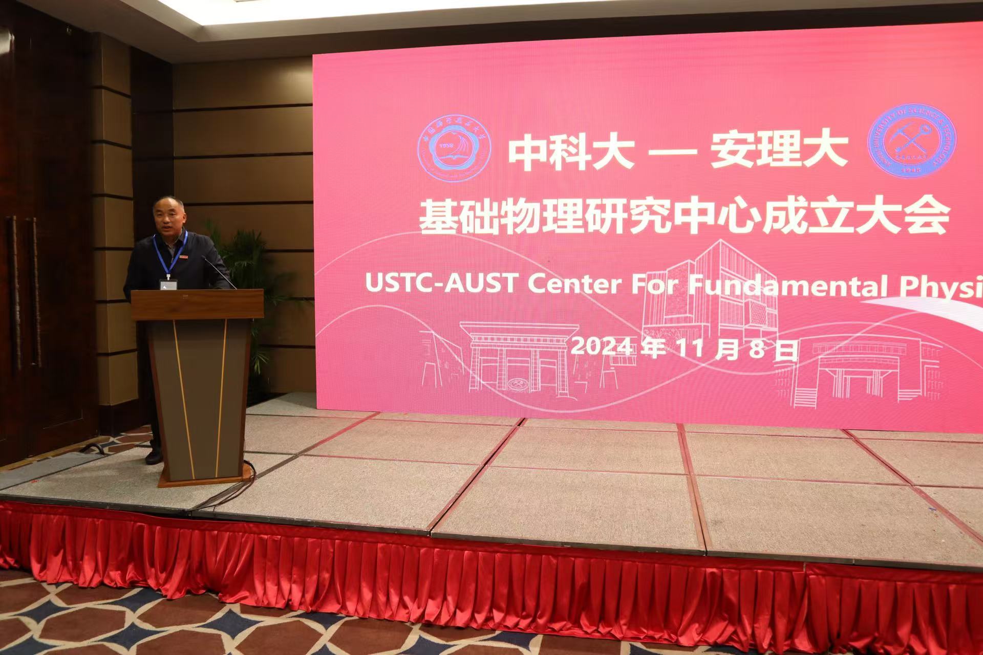 张平松致辞。他代表学校向参会的各位专家学者表示衷心感谢和热烈欢迎,对中心的成立表示祝贺,预祝中心在未来的工作中取得丰硕成果。他强调,中科大-安理大基础物理研究中心的成立是学校响应国家战略和区域发展规划的重要举措,旨在深化科研体制改革、推动学科建设和科学研究、培养高水平人才、促进学科交叉融合、支持学校“双一流”创建的重要平台。期待中心持续聚焦基础物理领域前沿科学问题,汇聚国内外优秀青年人才开展科学研究,提升学校竞争力。他鼓励双方发挥资源优势,培养青年教师,积极支持教师和学生到国外高校及企业访学,鼓励高年级本科生和研究生与中国科学技术大学开展合作研究,推动学术和实验研究的交流。