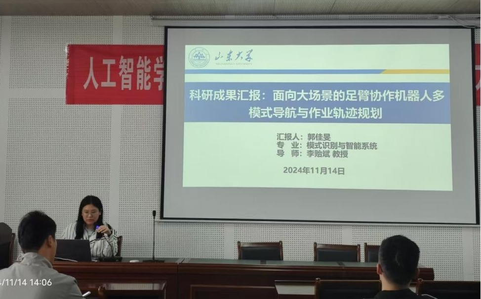 蔡昕烨介绍了学院在2024年国家自然科学基金项目成功申报上取得的历史性突破,并强调了本次会议对2025年国家自然科学基金申报工作的意义。郭佳旻老师作了题为《面向大场景的足臂协作机器人多模式导航与作业轨迹规划》的学术报告,研究聚焦于大场景移动作业系统的构建,设计了多模式移动作业系统,提出了基于自适应联邦滤波的领航员跟随算法,通过调整基座位姿扩大机械臂作业空间,设计了全身轨迹规划方法。曹顺心老师作了题为《低速重载行星齿轮箱故障特征增强与诊断方法研究》的学术报告,研究针对低速重载行星齿轮箱存在状态监测不准确、故障特征微弱难以提取等问题,提出了随机脉冲干扰检测与抑制方法,开展了行星齿轮箱单一微弱故障特征增强提取方法、复合故障解耦分离方法研究,构建了基于数据驱动的行星齿轮箱故障状态自动诊断方法,解决了工业大数据背景下的低速重载行星齿轮箱故障状态自动诊断问题。