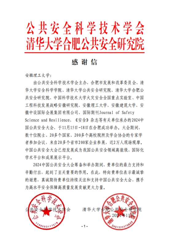 近日,我校收到由公共安全科学技术学会和清华大学合肥公共安全研究院联合发来的感谢信,对学校在2024中国公共安全大会筹备和举办过程中给予的鼎力支持和辛勤付出表示高度肯定和诚挚感谢。