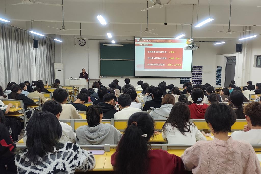 胡珊珊以《学生干部能力培养》为主题,向学生干部提出要求,一是要明确自己的角色定位,学生干部是学生,学生以学为主,要坚定自身理想信念,做好沟通师生的桥梁,努力传播正能量。二是要具备优秀的思想道德素质,本色做人,角色做事,努力提升文明行为习惯、道德品质和综合业务素质;三是不断增强个人的服务意识、集体意识、开拓创新意识以及初心意识;四是要建立良好的人际关系,要率先垂范,勤奋工作,无私奉献,既要大胆工作,又要讲究方式方法。