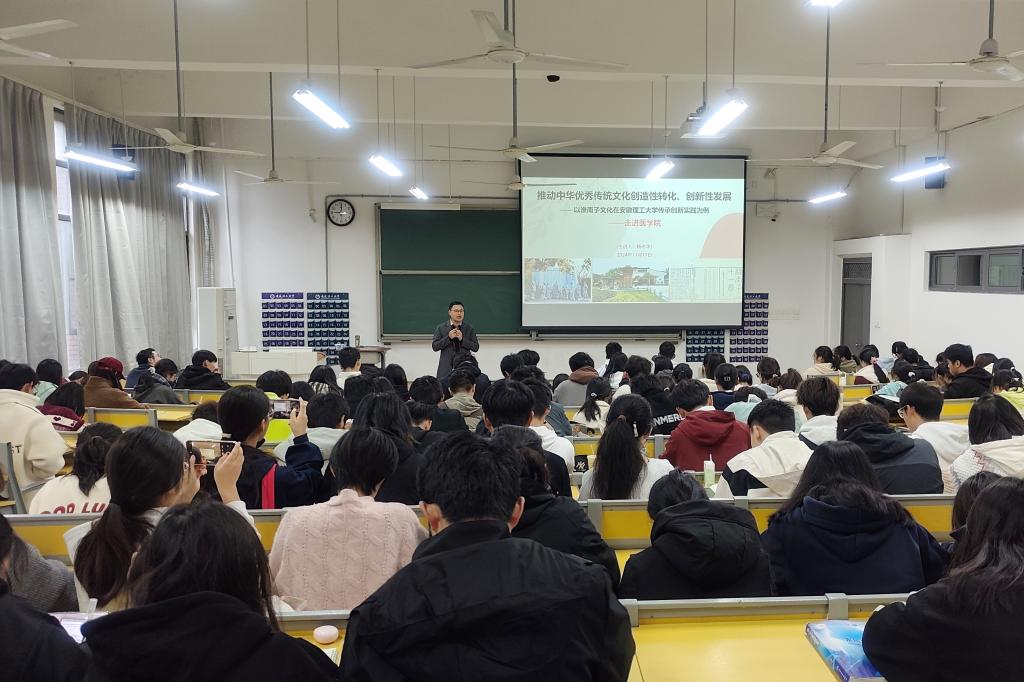 杨志华以《推动中华优秀传统文化创造性转化、创新性发展——淮南子文化在安徽理工大学传承创新实践为例》为题,结合《淮南子》这本历史经典著作的形成背景,介绍了其在中国古代思想文化史上的重要意义,重点讲述了《淮南子》的社会价值,如成语典故、二十四节气的文化等,图文并茂地讲解了耳熟能详、流传甚广的成语典故的诞生和推衍故事,让学员们对淮南的悠久历史和深厚文化有了进一步的理解,也感受到淮南这座城市独有的魅力。