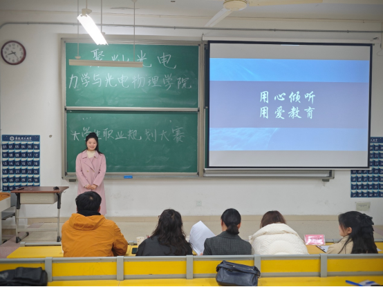 筑梦青春志在四方,规划启航职引未来。为进一步提升学生的职业生涯规划意识,帮助学生科学认知职业发展,制定合理的预期目标和阶段规划,不断提升职业素养和专业技能,11月19日,力物学院在明理北402成功举办第二届“聚灿光电杯”大学生职业规划大赛。大赛特邀力学与光电物理学院党委副书记郑孝莲和教师代表担任大赛评委。