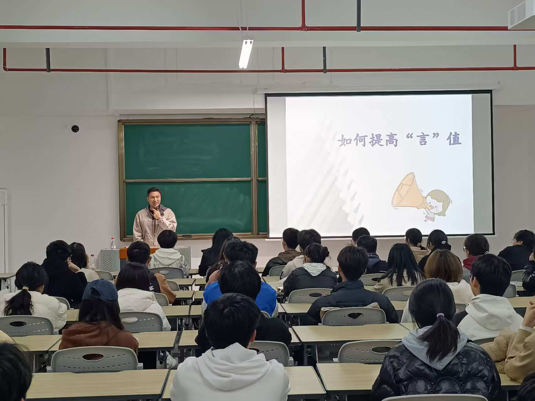 为提升新时代大学生社交技巧和人际交往能力,11月18日晚,党委宣传部邀请淮南电视台新闻综合频道制作部主任卞爱华在大创东204教室作了题为《如何提高“言”值》的主题讲座。100余名学生聆听了讲座。。