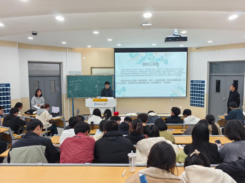 接着,主持人利用统分时间对现场每一位同学进行有趣的房树人测验。受测同学需要在纸上画出房子、树和人,通过三者之间的互动关系反映一个人的心理状态,从而使受测者更好地认识和调整自己。